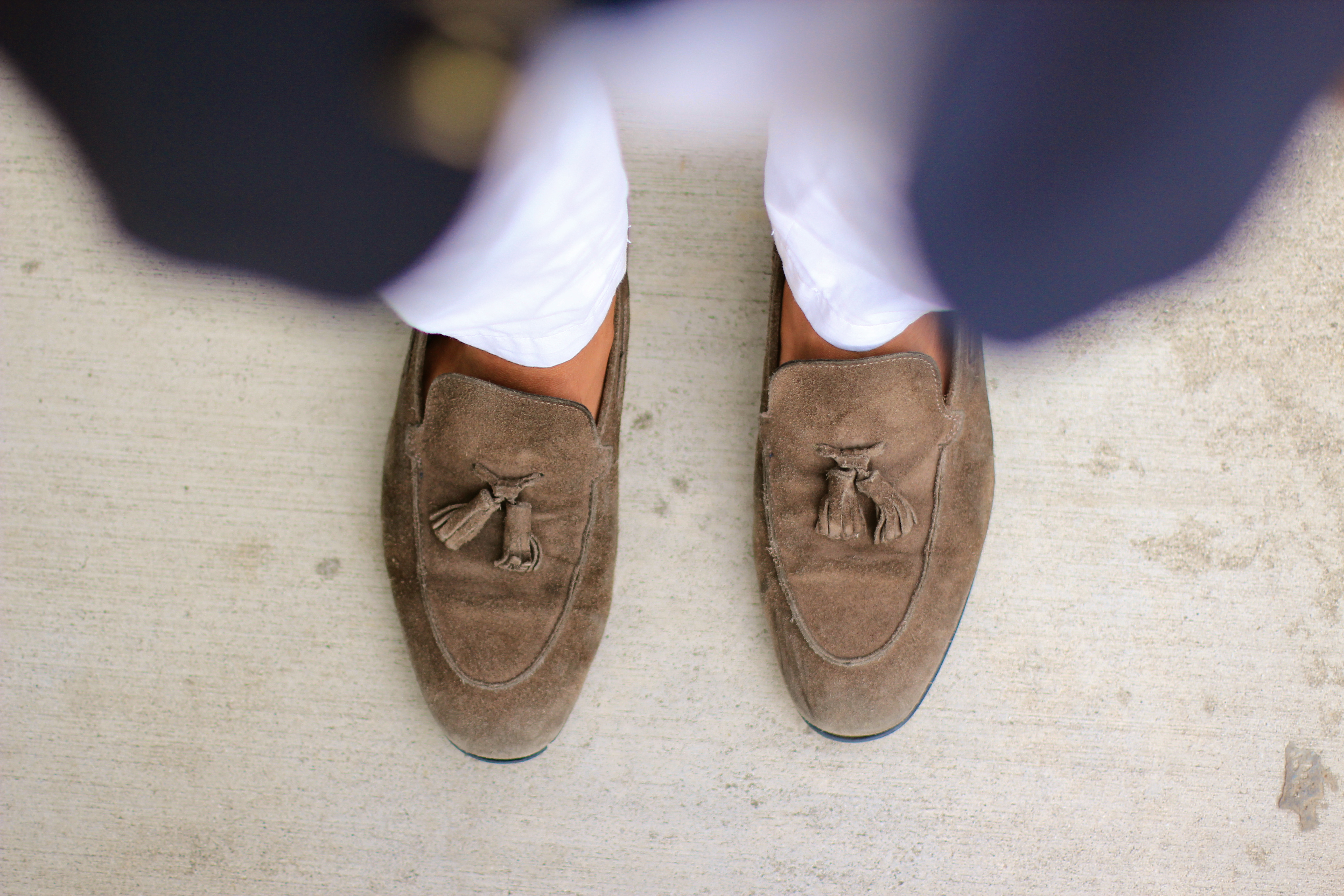 The sprezzatura of his outfit comes out now. We see that, like Christian, the back of his tie is longer and peaking out. It creates a casual, sloppy look that still seems well put together; this is the meaning of sprezzatura. He wears a straight fit pair of linen trousers and matches them perfectly with a casual, light brown suede pair of tassel loafers (without socks!). Most preppy people wear boat shoes or penny loafers, but these make the look distinctly italian.