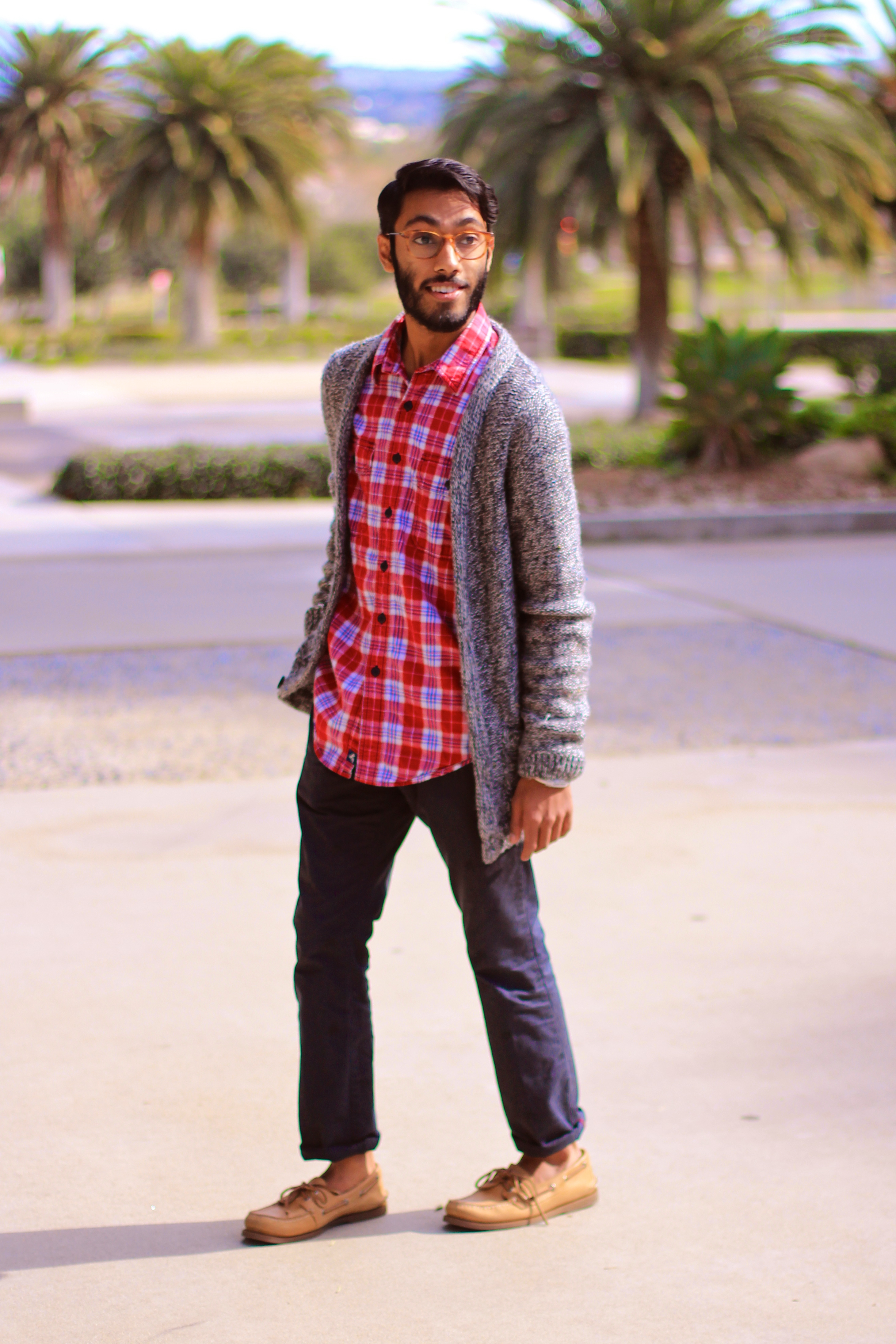 Flecked Wool Cardigan from TopMan, Flannel Shirt from Macy’s, Chinos from PacSun, Boat shoes from Sperry Top Sider