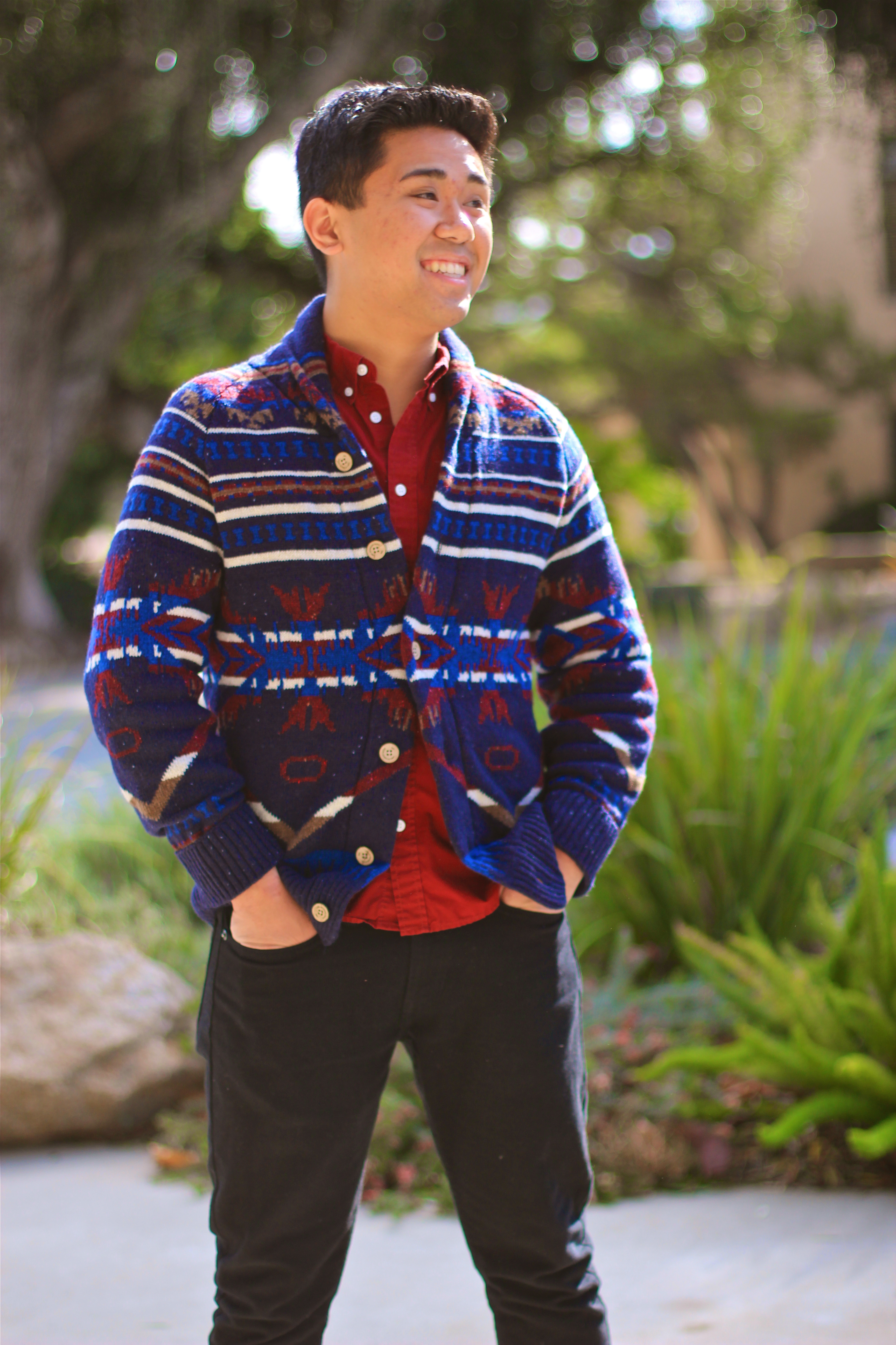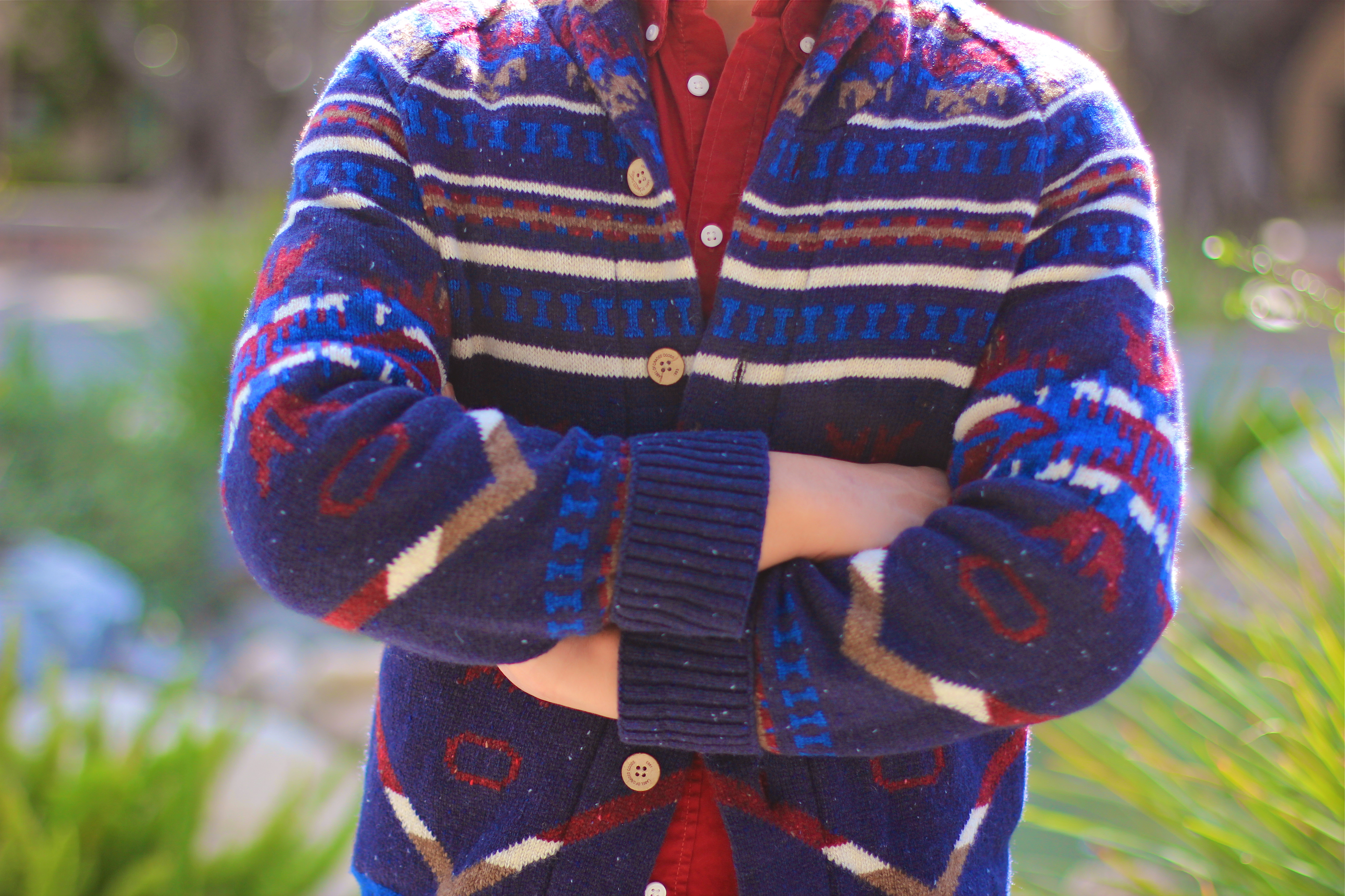 My cardigan is pretty fun. It has a sort of “Aztec” or “tribal/native” pattern that makes it very versatile. However, when wearing large patterns, its always good to scale or wear something plain. Underneath the cardigan, I’m wearing a normal red shirt and a black jeans, cuffed up with my favourite spectator shoes. But lets focus on the cardigan.