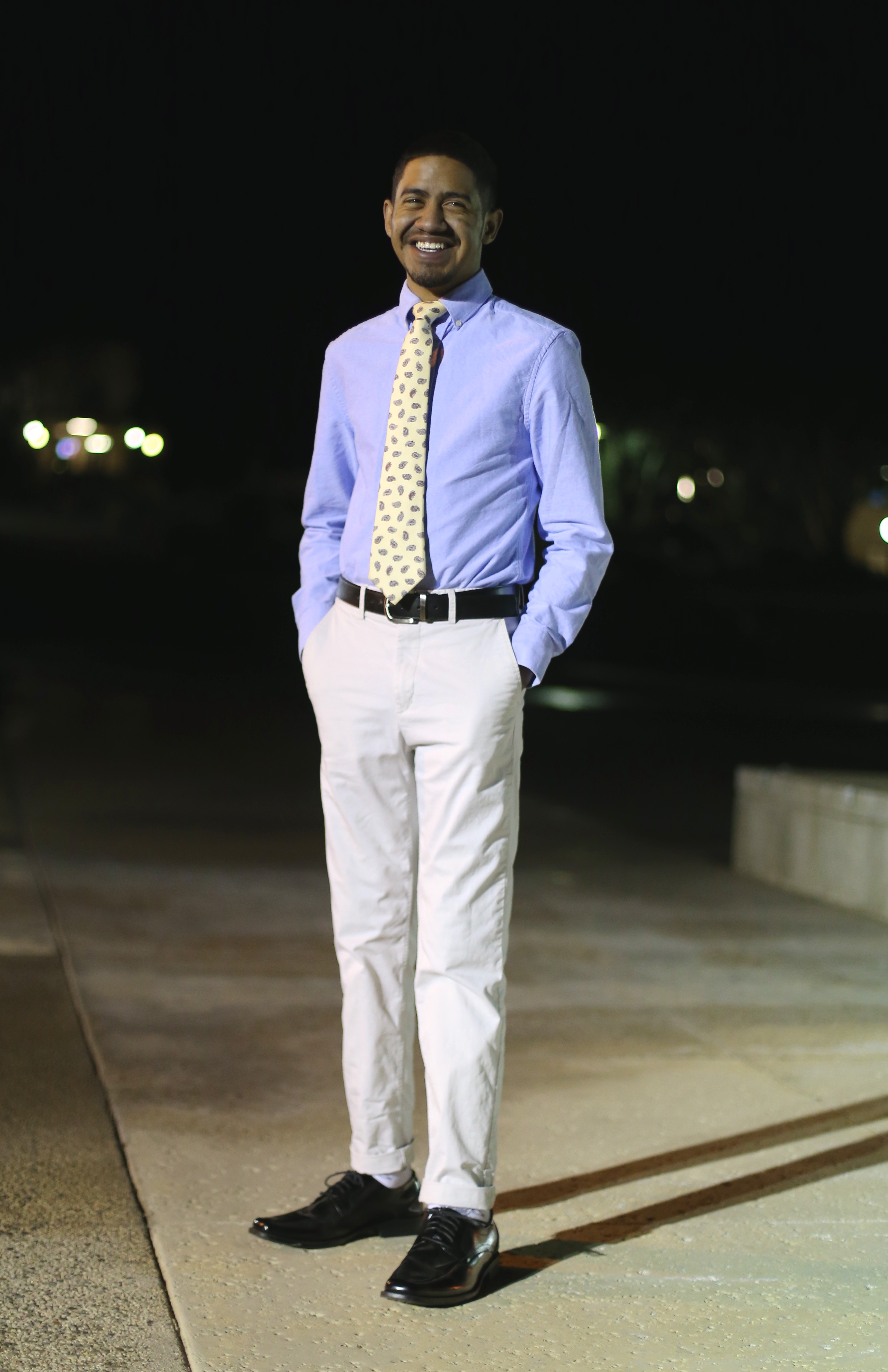 Ian is a game-changer. Amidst a world of ties and blazers and buttoned up shirts, he goes with typical beach fashion. Pulling together typical blues and browns, his color pallet just screams cool and casual. His light khaki shorts are just the right length, ending a bit above the thigh. Ian’s denim shirt adds texture to his outfit, but he keeps it unbuttoned as an extra layer. His unique touch is the Panama Hat, an awesome hat that has lost its touch in modern times.