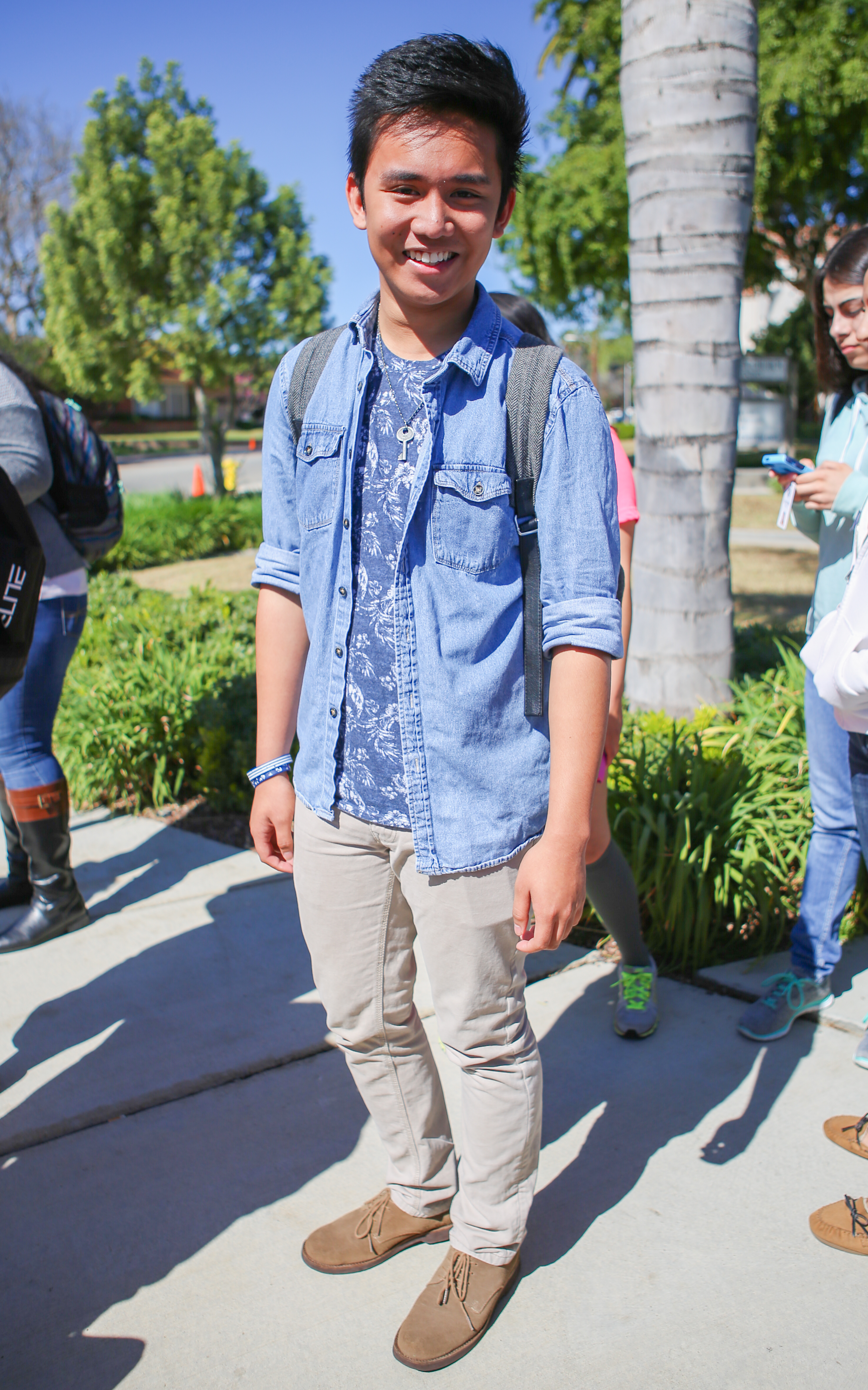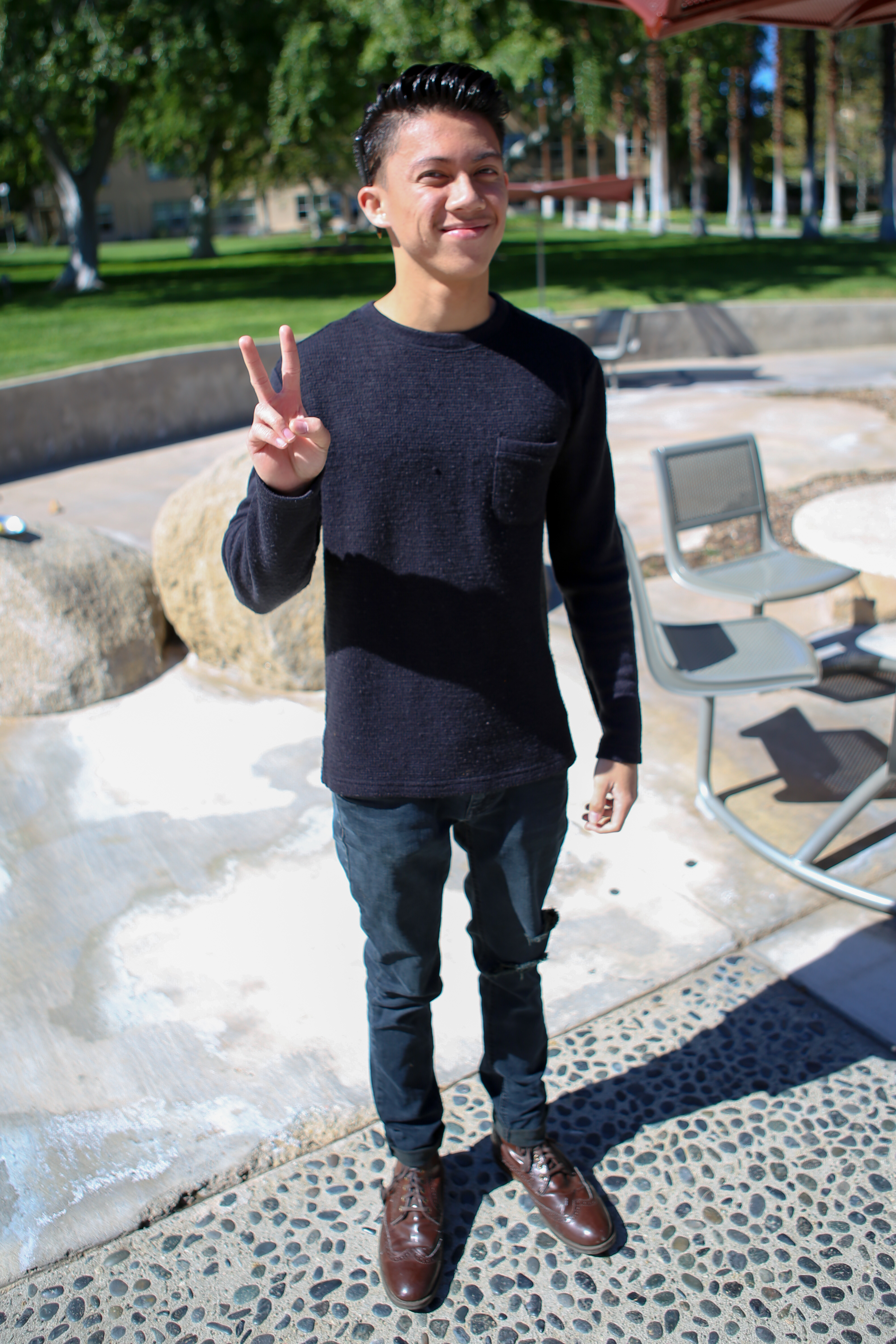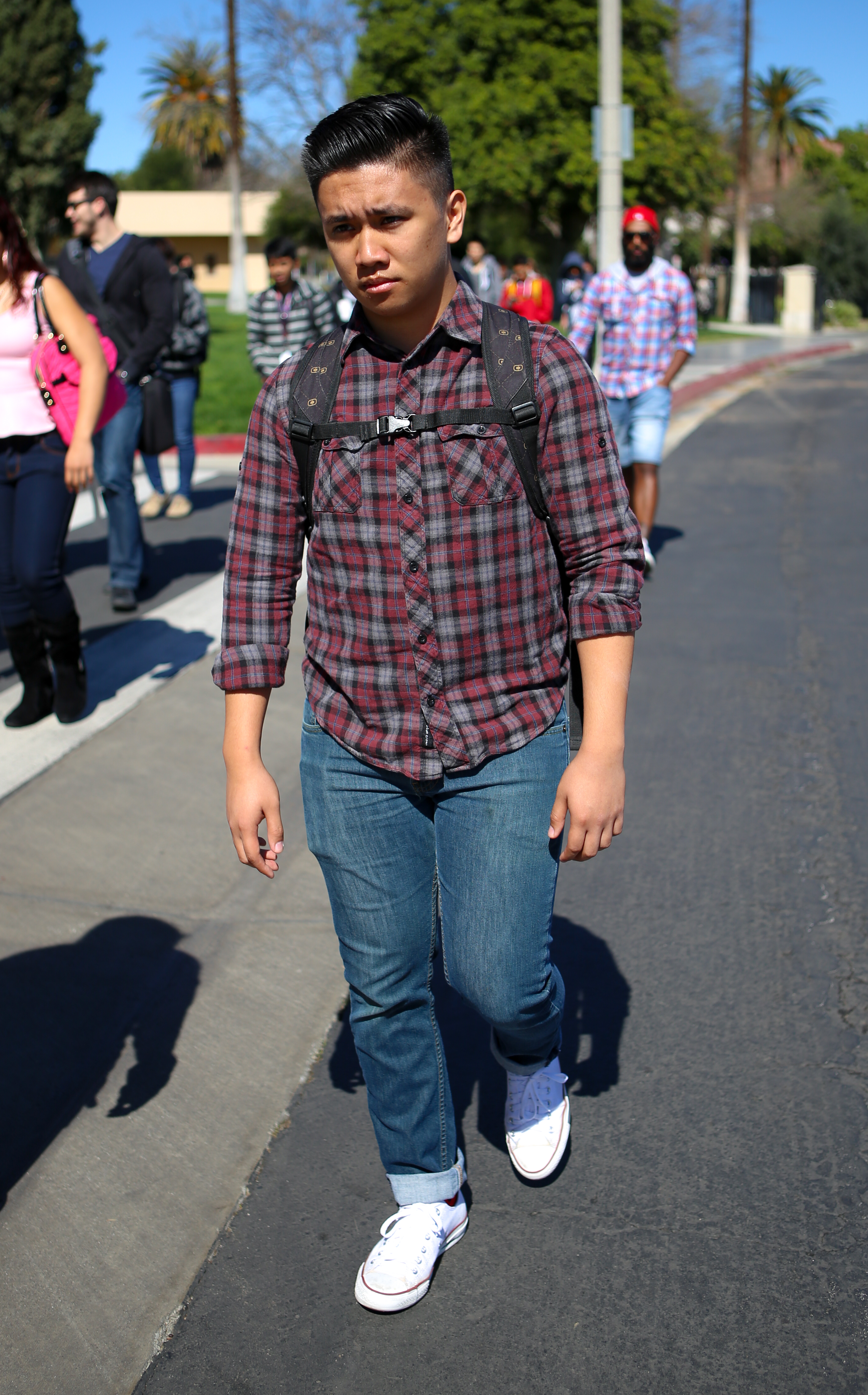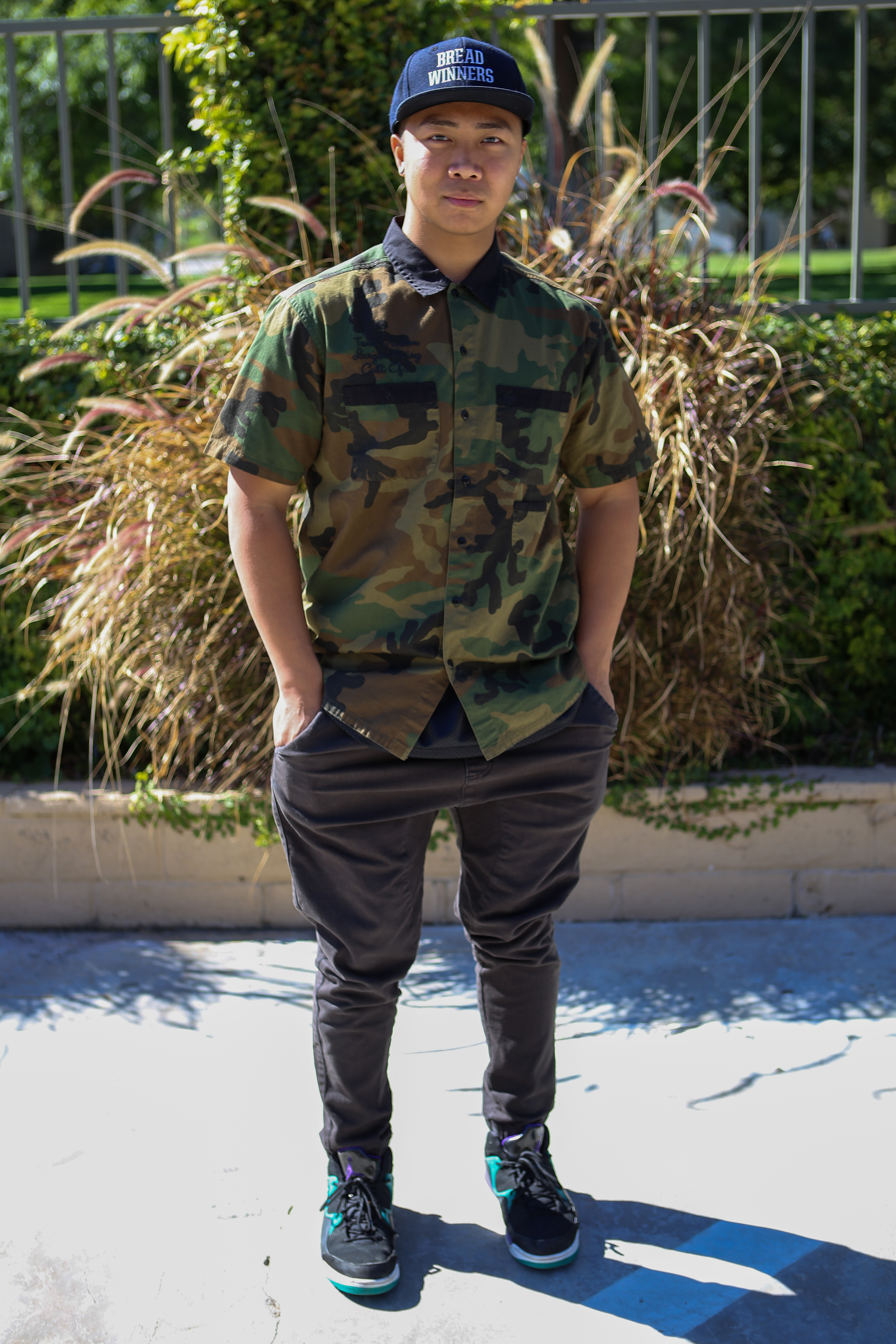 I found myself naturally attracted to Aldenn’s outfit because I dress myself almost exactly the same lol. Once again you can never go wrong with a long sleeve button up and jeans. Cuffing the jeans allows for more attention to be drawn to the shoes, and that works perfectly with the pristine white of his Converse’s. His haircut tops it all of for a very clean look.