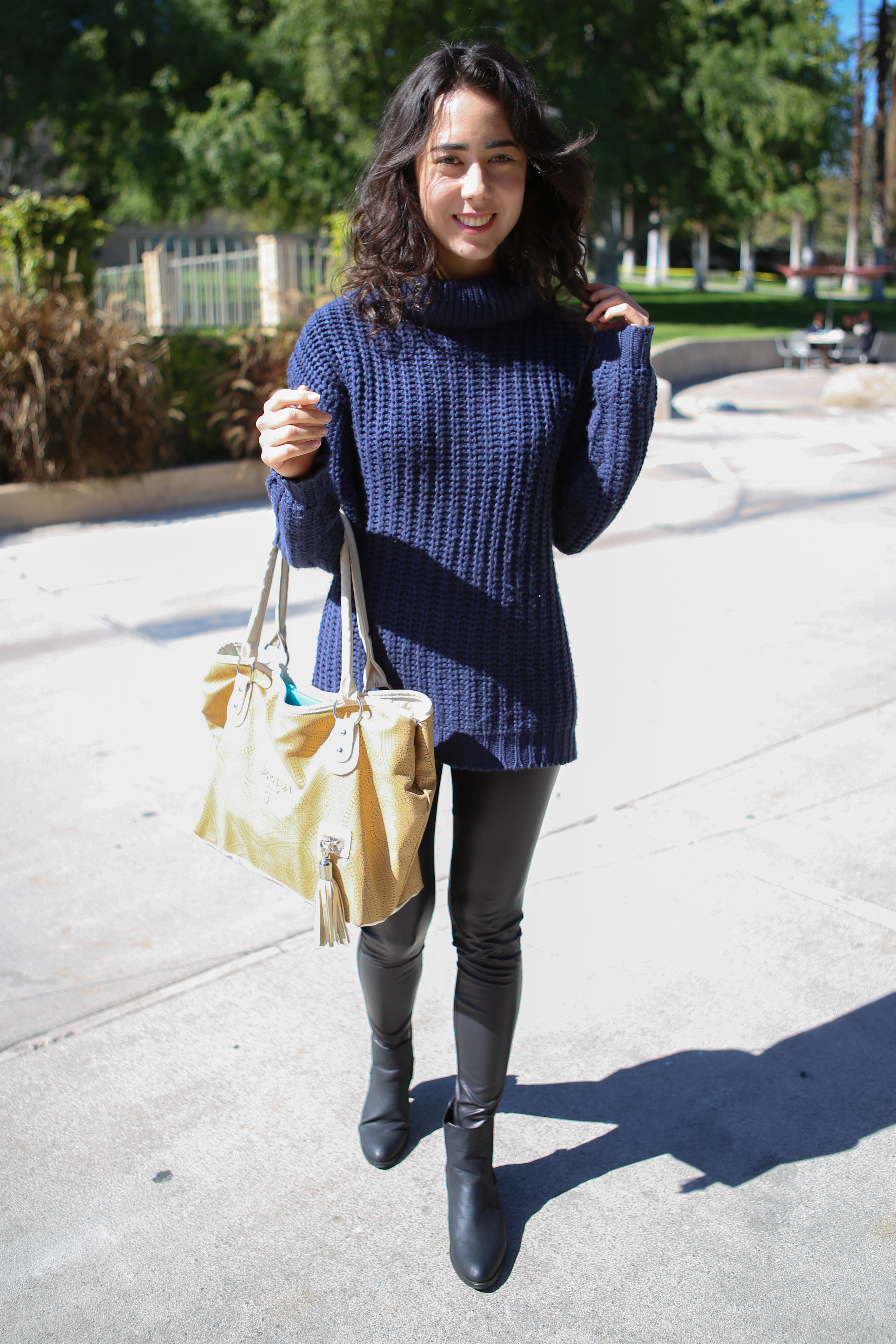 One of my personal favorites, I think the “pleather” leggings with boots combination works flawlessly with the muted blues of her sweater, and the brightness of the bag balances everything.