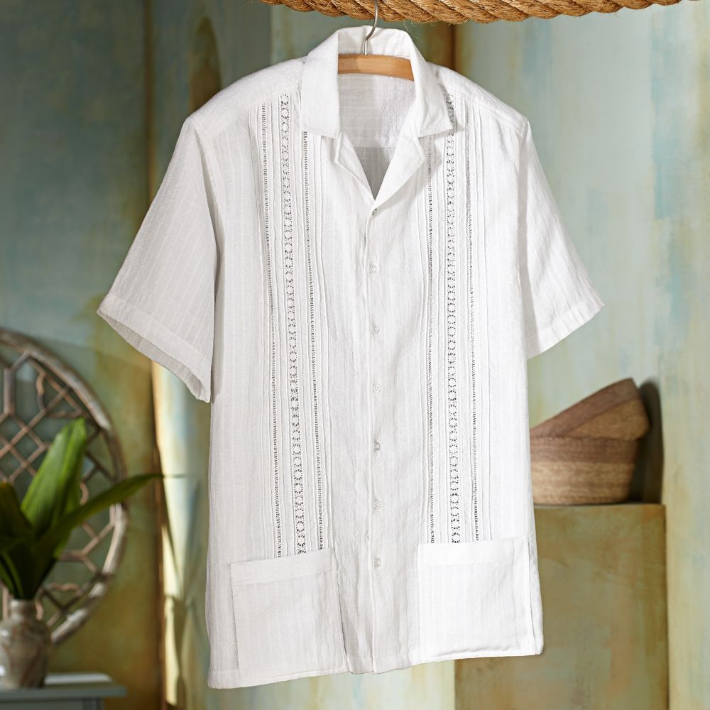 And no, we haven’t found anything from the vintage era that refers to them as “cuban” or “camp collar” shirts. Even Die, Workwear didn’t know what they were called and only referred to them as vacation shirts, even though they were worn year round. Based on conversations we’ve had with other vintage enthusiasts (who have scans and physical copies of menswear catalogs), there isn’t any mention of the type of shirt other than sport shirt, convertible collar, or loop collar. The nicknames might be due to the fact that sportshirts wer extremely popular as casual wear (ie; to wear camping) during 1940s-1960s. I defy you to find a classic midcentury picture of a family camping that does not have a sport shirt. The “cuban collar” term probably points to its similarity in design to the guayabera shirt, a cultural Cuban shirt. Note that the guayabera lacks the loop fastening or any top button.