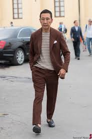 This next one is more of an experiment and not something I’d consider wearing as a full outfit. My first thing was to try and see how sandals would work with a full suit. As I don’t have many casual suits other than this brown cotton one, it’s what I went with. Instead of an aloha shirt like Tony or attempting to try a tie like Nicola Radano, I just leaned into the casualness and wore an indigo striped tee. It’s sort of inspired by an outfit worn by Camoshita-san at last year’s Pitti, but I’m sure I’ve seen a similar look in a Japanese magazine.