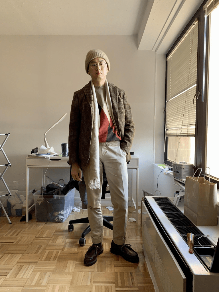 And to bring the intro to the present, my new found agency (in confidence and finances) allowed me to be a bit indulgent in the lace-up component of my wardrobe. It’s not that I’m tired of my loafers but now that I’ve gotten my current dream ones (Alden 563), I want to expand a bit. It’s a bit like how after a navy suit, you want a brown one. So that’s why you may have seen a bit more lace-ups than usual. I still wear my longwings and wallabees but I’ve added new ones to my canon, which include the black PTB (a Yuketen smaple), Alden Algonquin V-tips (quite ivy), two one blucher mocs and a rugged sole moc toe derby (both Yuketen samples again). They have all been quite helpful in helping me lean into more a different vibe, one that doesn’t slouchy-but-dainty loafers such as rugged aesthetics like the Euro-hiking look.