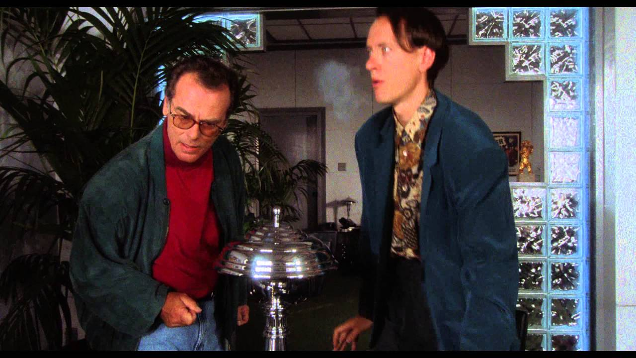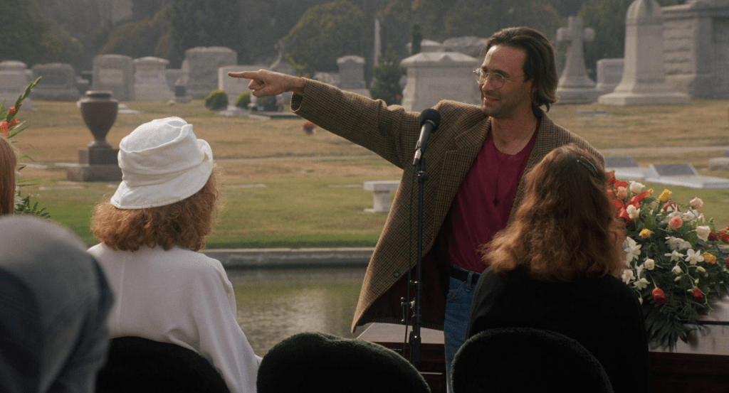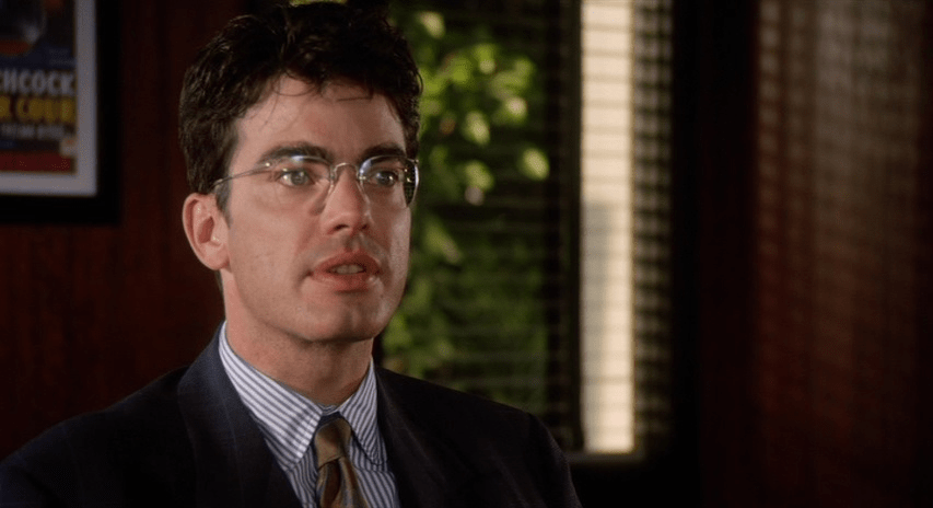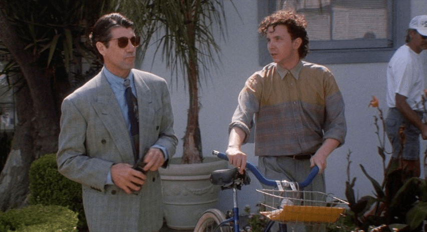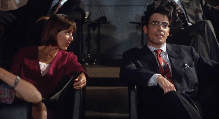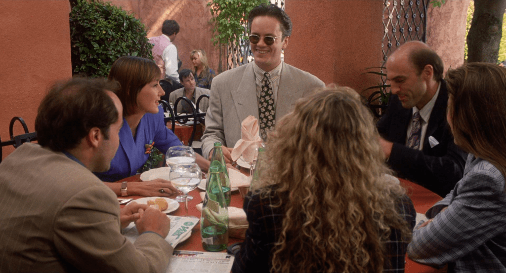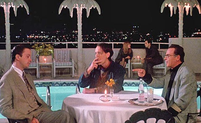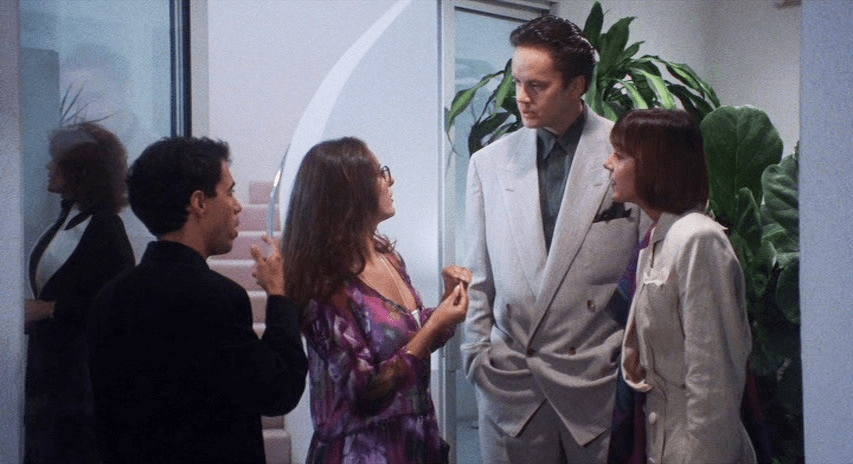 Everyone in the film is dressed pretty well, which makes sense considering its full of well-to-do execs, aspiring writers, and famous actors (playing themselves). All of the execs have the Yuppie/corporate look in spades, donning long slouchy DBs, foulard ties, striped shirts, and slick hair. It’s quite a contrast to how suits are worn today in pop culture, many of which are vibrant and very slim fit.