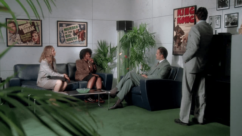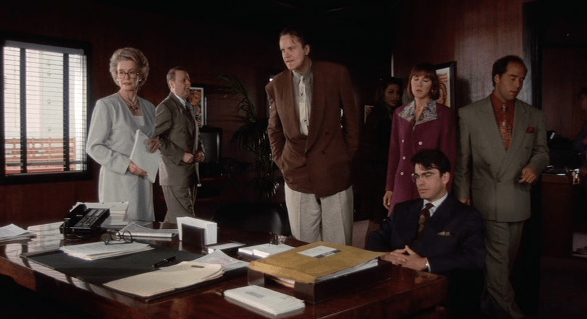 The other execs follow suit (lol) with their own DBs, multi-stripe shirts, and abstract ties. It’s always funny to see how much more interesting corporate style used to be; now we’re stuck with plain, open collar spread collar shirts and electric blue suits. While the movie is clearly very 90s, these exec “uniforms” give off an even older vibe, looking like a 90s does 40s/50s film.